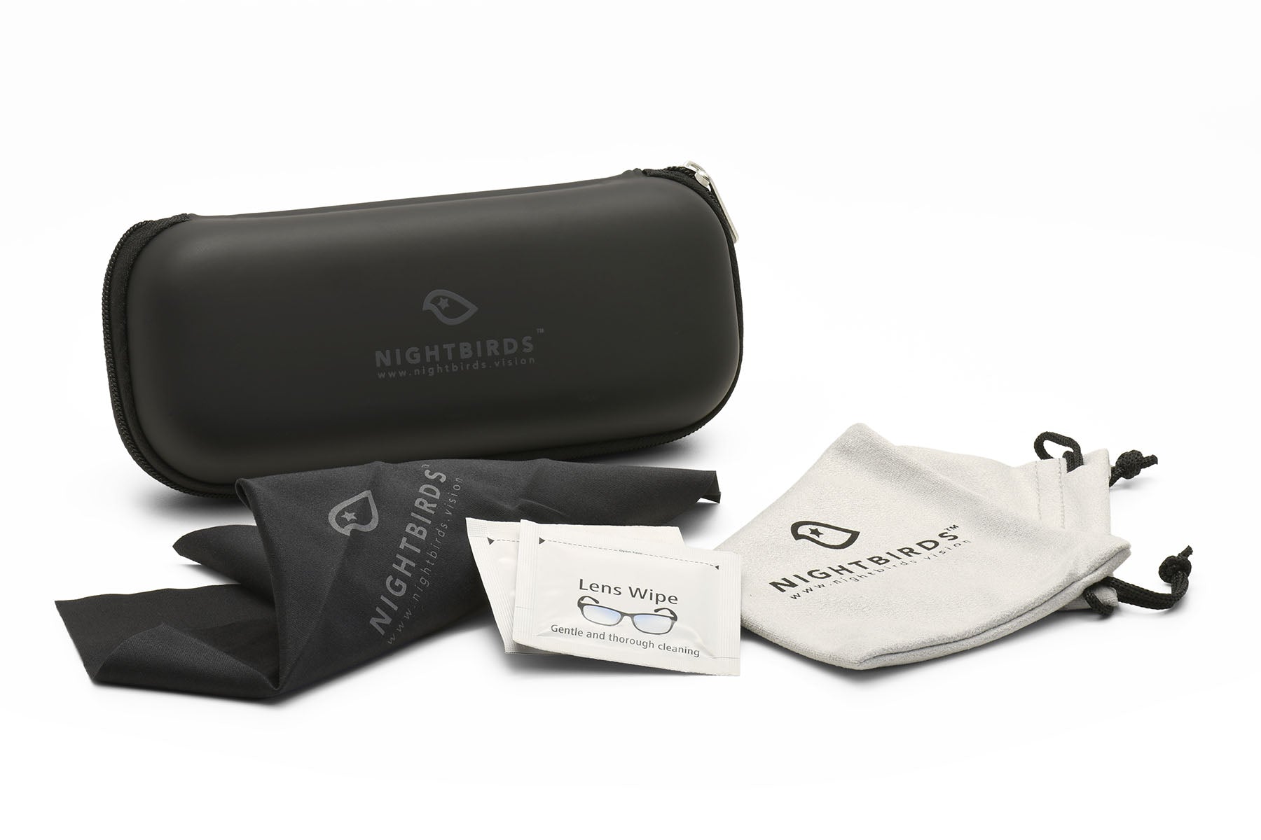 For maximum optical performance, NightBirds lenses are anti-reflection coated and include a water & oil repellant coating on the front and back surfaces. To remove dust and smudges from routine use, NightBirds eyewear may be cleaned using an optical-grade cleaning spray and the included microfiber cloth. The glasses can also be cleaned with mild dish soap and warm water, and then dried and polished with the included microfiber cleaning cloth. Do not clean the product with detergents or solvents such as rubbing alcohol. Do not wipe the frame or lenses with abrasive materials such as paper towels or clothing. Do not store the glasses in direct sunlight under extreme heat, such as on a car dashboard. For maximum lifespan, always store the eyewear inside the included case.
